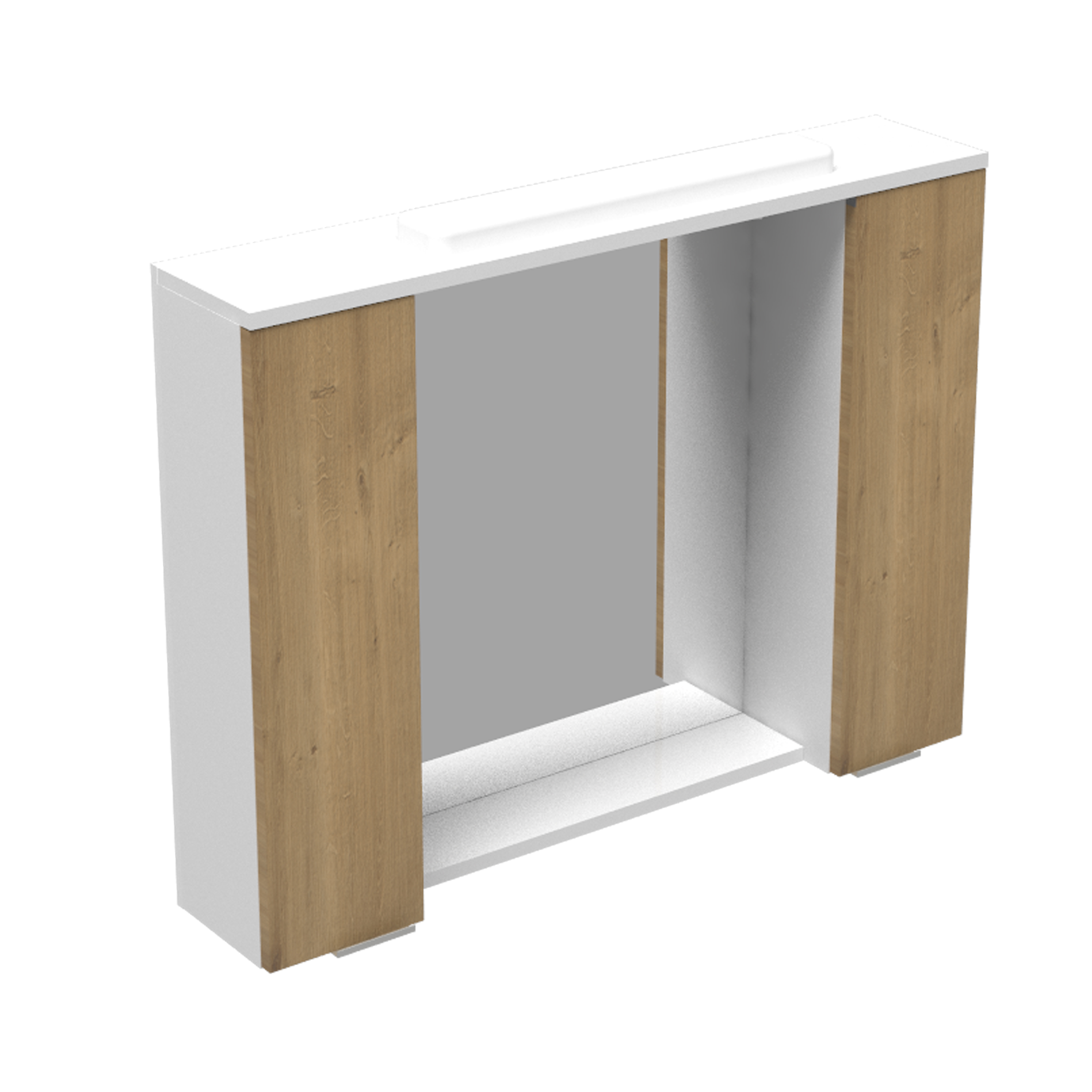 Gornji ormarić kupaonskog kompleta ANA s LED rasvjetom, praktičnim prekidačem i utičnicom u dekoru bardolino s toplim drvenim frontama i mat bijelim korpusom pruža dodatnu pohranu i osvjetljenje, savršeno za uredan i ugodan kupaonski prostor.