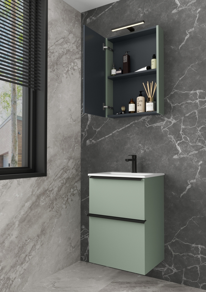 BIT 50 donji kupaonski ormarić s keramičkim umivaonikom u dekoru eukaliptus zelena donosi svježinu prirode u vašu kupaonicu. Dvije ladice za pohranu omogućuju jednostavno organiziranje, dok mirna, zelena nijansa stvara harmoniju u prostoru. Za samostojeću varijantu, crne mat nogice (šifra 16077) mogu se kupiti odvojeno.