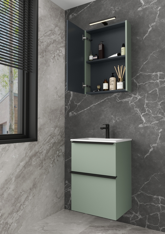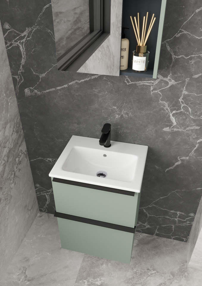 BIT 60 donji kupaonski ormarić s keramičkim umivaonikom u dekoru eukaliptus zelena donosi svježinu prirode u vašu kupaonicu. Dvije ladice za pohranu omogućuju jednostavno organiziranje, dok mirna, zelena nijansa stvara harmoniju u prostoru. Za samostojeću varijantu, crne mat nogice (šifra 16077) mogu se kupiti odvojeno.
