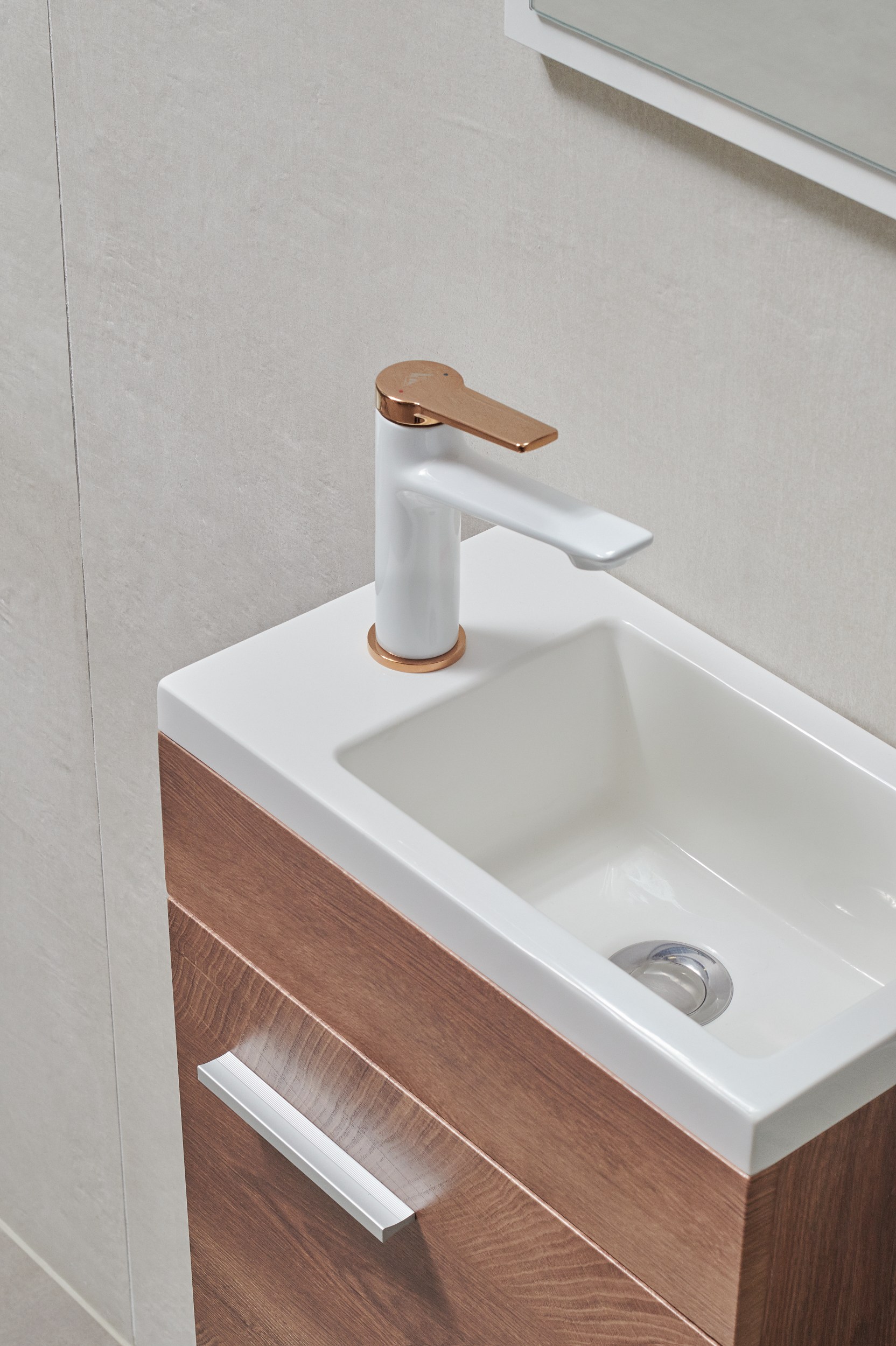 Kupaonski ormarić Crumb s integriranim umivaonikom unosi dozu suvremenog minimalizma u prostor, štedi prostor i osigurava urednost, uklapajući se lako u manje kupaonice i moderne interijere, a dolazi s praktičnim desnim otvaranjem vrata.