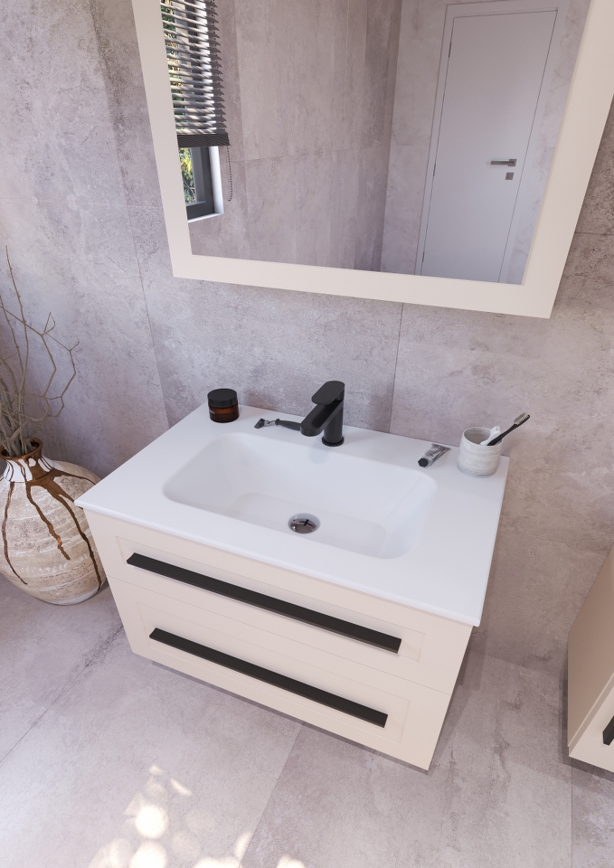 ETERNITY 80 donji kupaonski ormarić u kašmir boji s crnim ručkicama pruža suvremen i sofisticiran izgled vašoj kupaonici. Kašmir boja stvara smirenost, dok crna ručkica unosi moderan kontrast i dinamičnost u dizajn. Ovaj ormarić savršeno se uklapa u moderne kupaonice koje traže funkcionalnost, uz naglasak na stil.