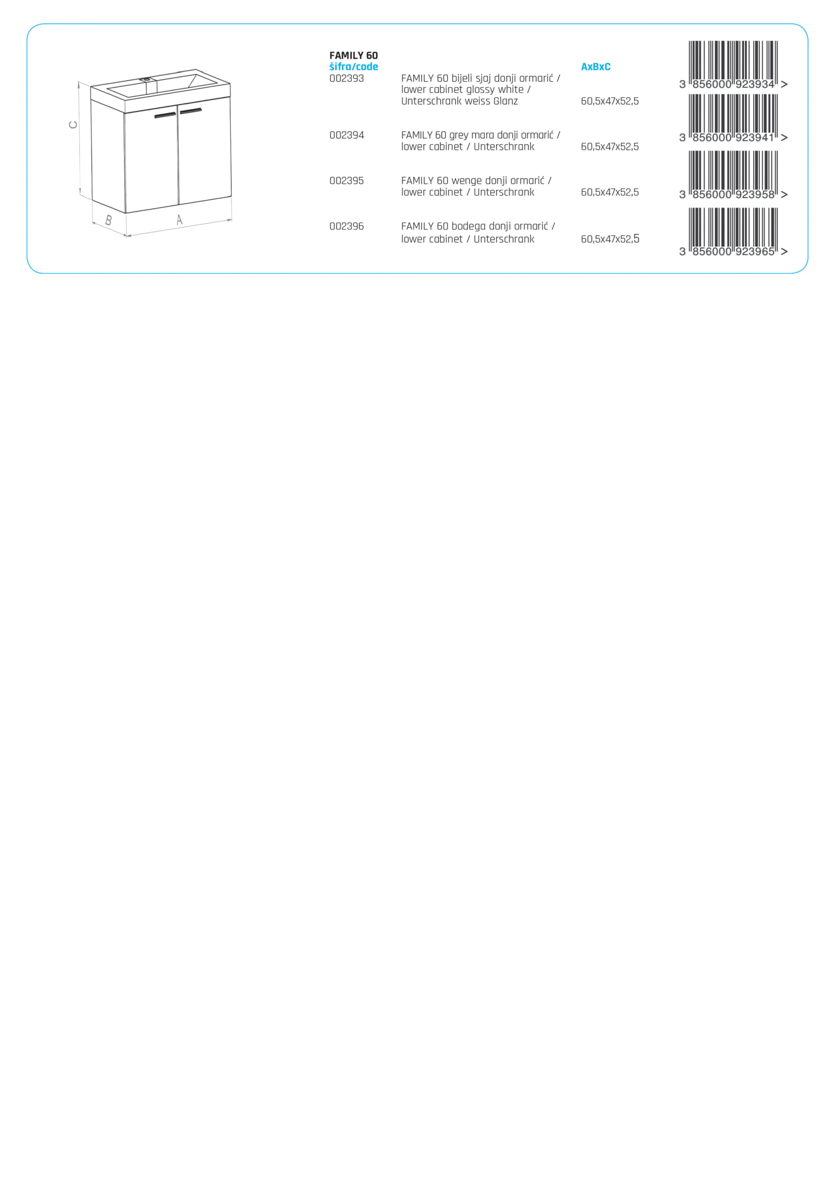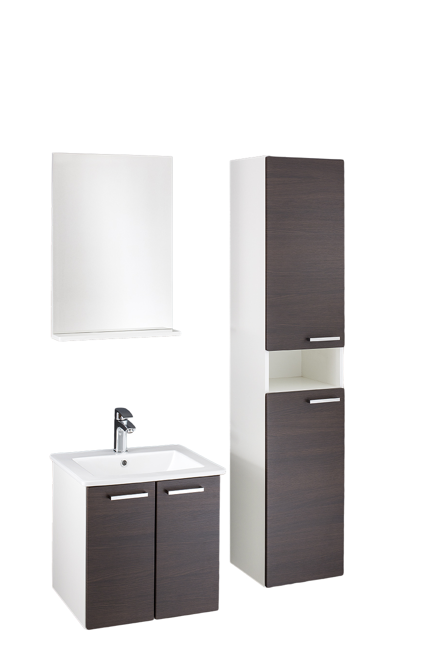 Donji ormarić kupaonskog kompleta FAMILY 60 u dekoru wenge s bijelim korpusom, MDF frontama obloženim PVC folijom i kromiranim ručkicama donosi toplinu drvenog dekora i moderan kontrast u prostor, a s uključenim keramičkim umivaonikom pruža praktično rješenje za urednu i funkcionalnu kupaonicu.