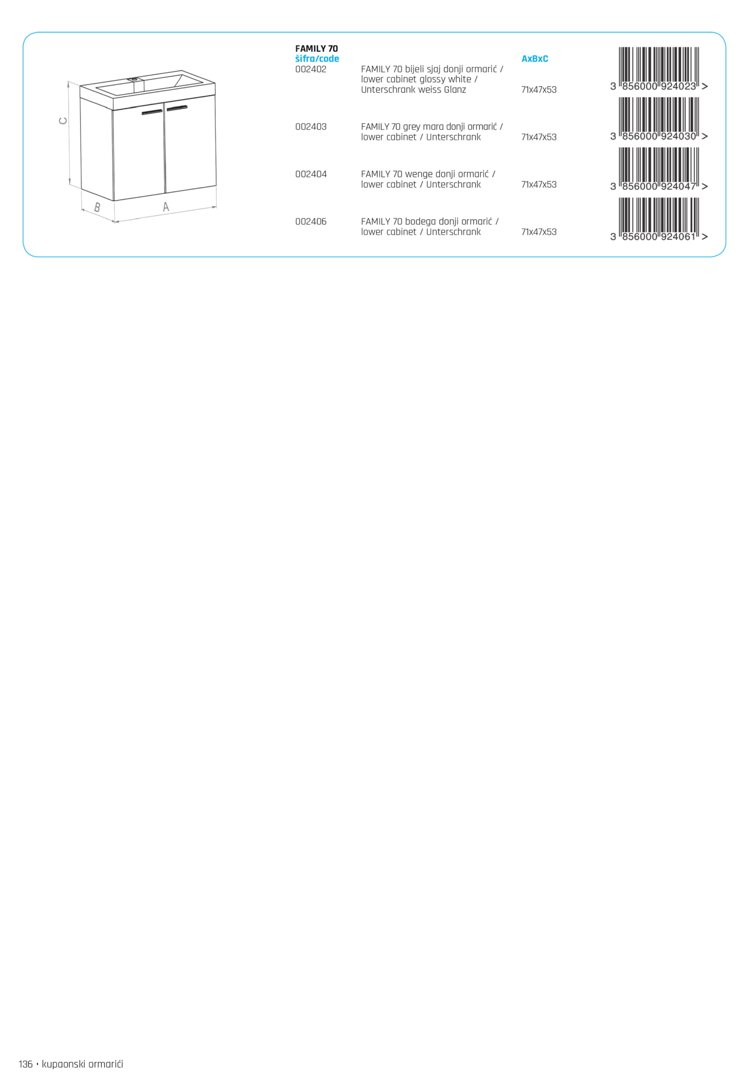 Donji ormarić kupaonskog kompleta FAMILY 70 u dekoru wenge s bijelim korpusom, MDF frontama obloženim PVC folijom i kromiranim ručkicama donosi toplinu drvenog dekora i moderan kontrast u prostor, a s uključenim keramičkim umivaonikom nudi praktično rješenje za urednu i funkcionalnu kupaonicu.