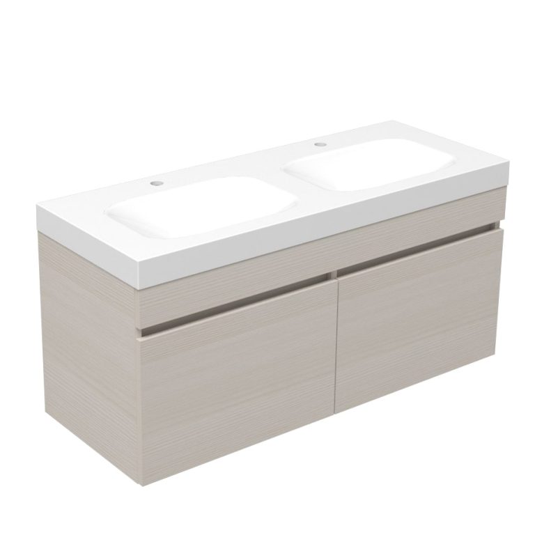 Donji kupaonski ormarić u dekoru bodega opremljen dvjema dubokim ladicama i dvostrukim ugradnim umivaonikom od umjetnog sjajnog mramora, pruža obilje prostora za odlaganje i praktičnost, dok soft close sistem zatvaranja osigurava tiho i ugodno korištenje.