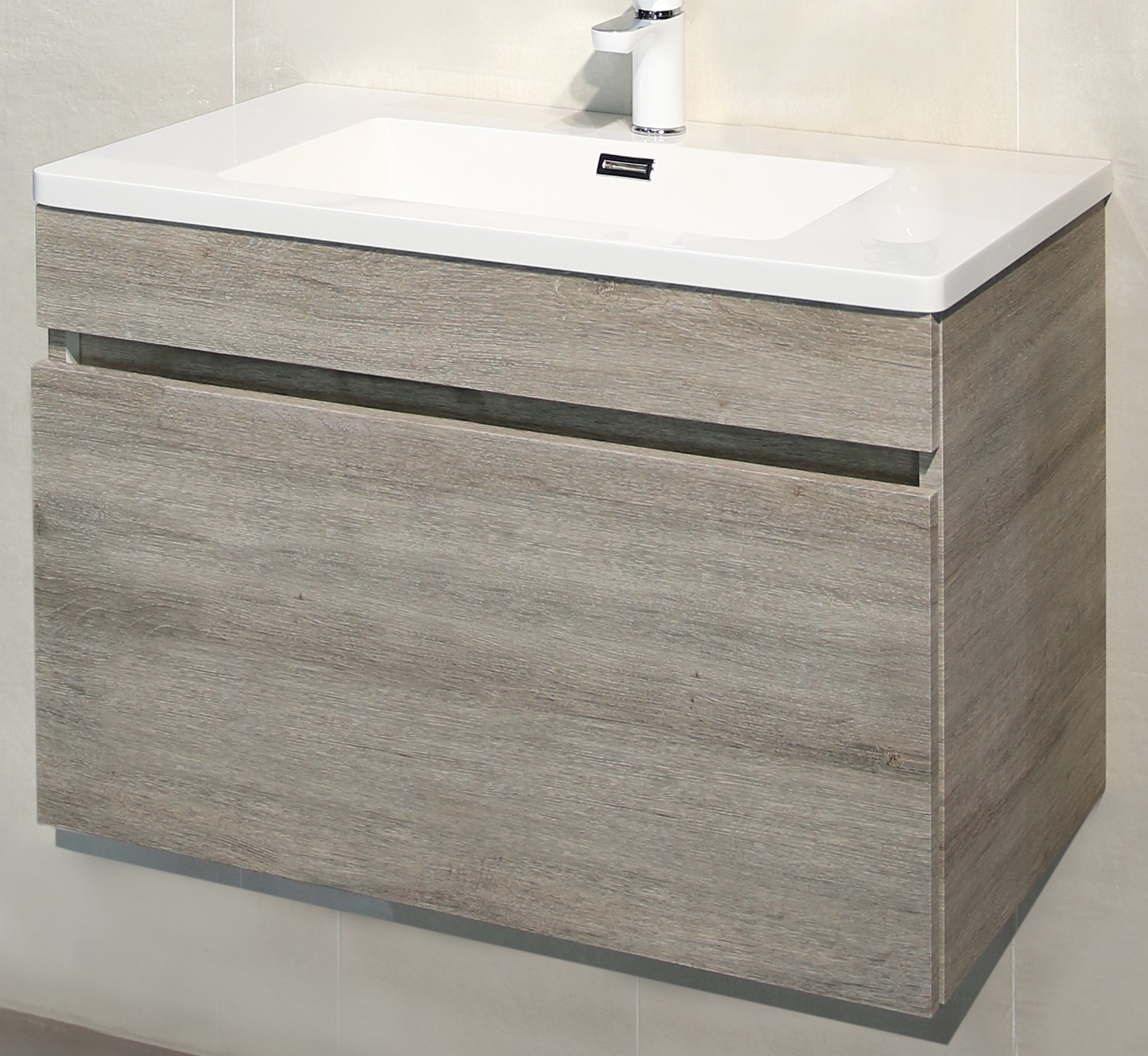 Donji kupaonski ormarić u dekoru grey mara s jednom dubokom ladicom i ugradbenim umivaonikom od umjetnog sjajnog mramora nudi prostran i praktičan prostor za odlaganje, uz soft close sistem zatvaranja za tiho i ugodno korištenje.