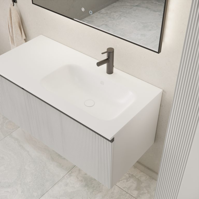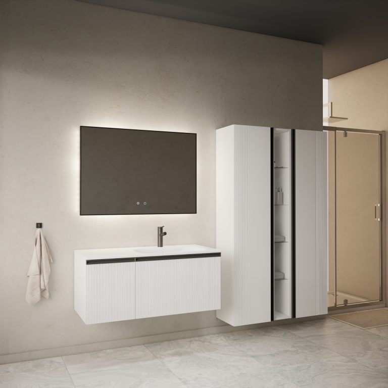 Donji ormarić kupaonskog kompleta Mirage u bijelom mat dekoru s crnom ručkicom. Opremljen je s tri ladice koje nude obilje prostora za odlaganje. Posebno izrađene fronte od MDF-a naglašavaju čistoću linija i kvalitetu izrade. Unutarnja skrivena ladica otvara se i zatvara nježno, laganim pritiskom. Umivaonik od lijevanog mramora prodaje se zasebno – šifra artikla 002567.