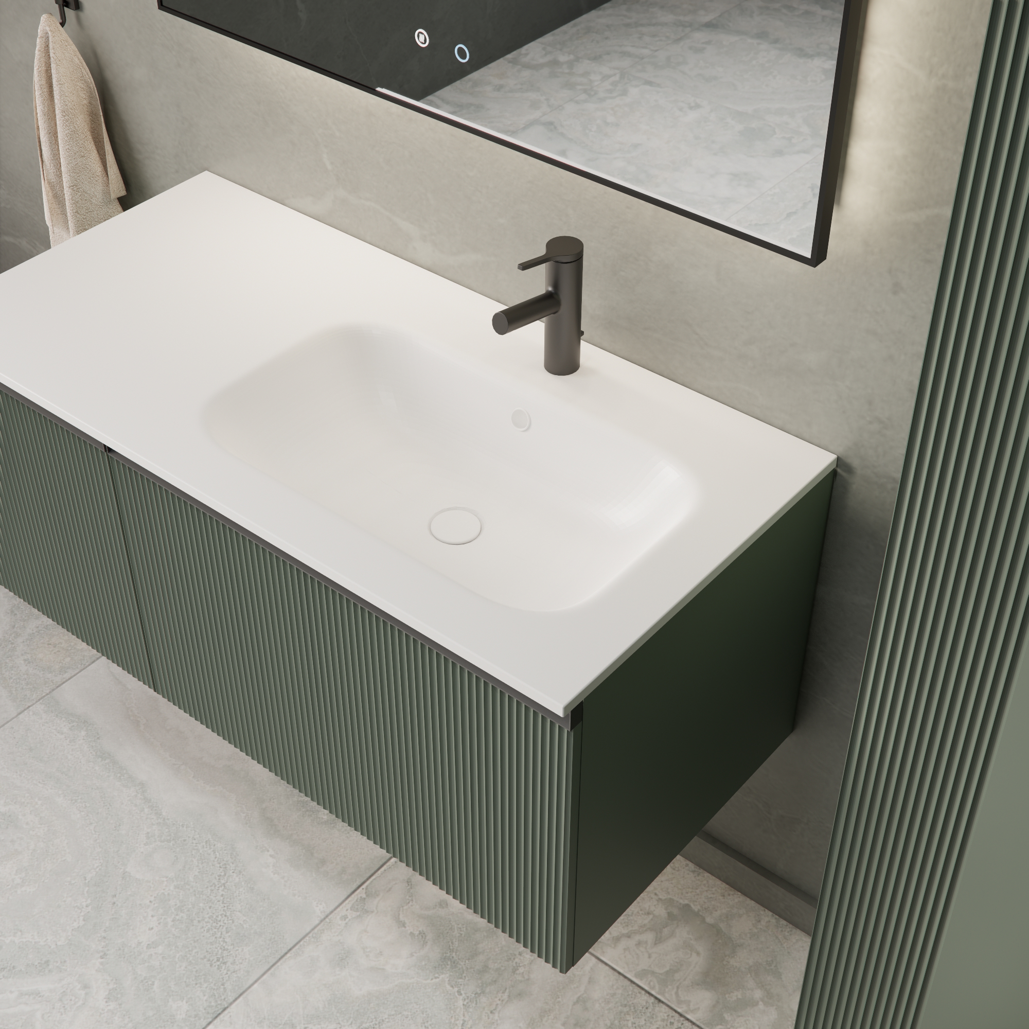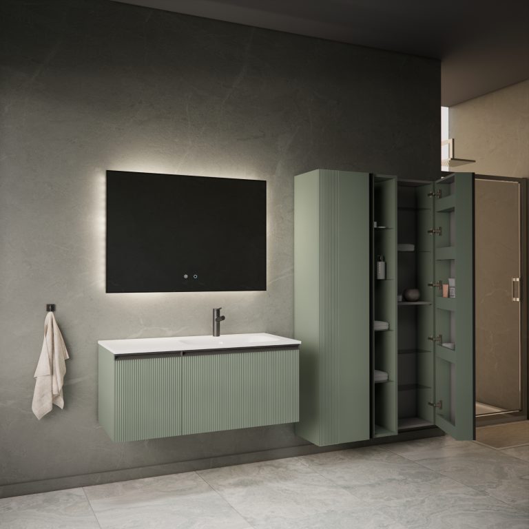 Donji ormarić kupaonskog kompleta Mirage u zelenom mat dekoru s crnom ručkicom. S tri prostrane ladice pruža dovoljno mjesta za sve kupaonske potrepštine. Fronte od MDF-a izrađene su posebno za ovaj model, čime se postiže sklad između dizajna i trajnosti. Unutarnja skrivena ladica reagira na lagani pritisak i tiho se zatvara. Umivaonik od lijevanog mramora prodaje se odvojeno – šifra artikla 002567.