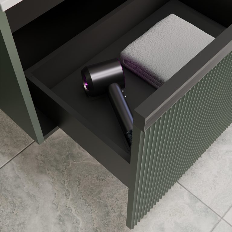 Donji ormarić kupaonskog kompleta Mirage u dekoru zeleni mat s crnom ručkicom. Opremljen je s tri ladice što nudi puno mjesta za odlaganje. Unutarnja skrivena ladica se nježno otvara i zatvara laganim pritiskom. Umivaonik od lijevanog mramora se prodaje odvojeno – šifra artikla 002568.