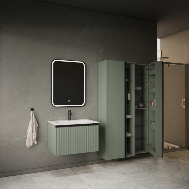 Donji ormarić kupaonskog kompleta Mirage u dekoru zeleni mat s crnom ručkicom opremljen jednom dubokom ladicom. Sofisticirani dizajn skladno se stapa sa suptilnom formom umivaonika izrađenog od lijevanog mramora. Umivaonik se prodaje odvojeno - šifra artikla 002569.