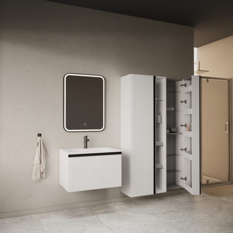 Donji ormarić kupaonskog kompleta Mirage u dekoru bijeli mat s crnom ručkicom opremljen jednom dubokom ladicom. Sofisticirani dizajn skladno se stapa sa suptilnom formom umivaonika izrađenog od lijevanog mramora. Umivaonik se prodaje odvojeno - šifra artikla 002576.