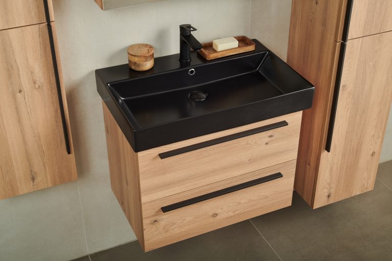 Donji ormarić kupaonskog kompleta SHARP u dekoru hrast natural s crnom ručkicom pruža funkcionalno rješenje za kupaonicu. Nadgradni umivaonik Olivia dostupan je u bijeloj (šifra 16300) i crnoj boji (šifra 16301). Sifon i umivaonik prodaju se zasebno.