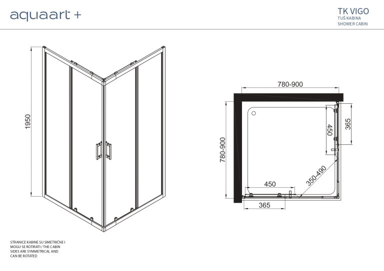 TK VIGO pravokutna tuš kabina visine 195 cm nudi moderan dizajn i vrhunsku praktičnost. Kaljeno prozirno staklo debljine 6 mm i aluminijski profili osiguravaju elegantan, ali i čvrst izgled, dok dvostruki kotačići omogućuju glatko i tiho klizno otvaranje. Kabina je prilagodljiva u dužini stranica od 780 do 900 mm, što je čini idealnom za tuš kade dimenzija 80 i 90 cm. Zahvaljujući kompenzaciji od 20 mm i reverzibilnom dizajnu, kabina se lako prilagođava različitim kupaonskim prostorima te pruža potpunu slobodu pri montaži.