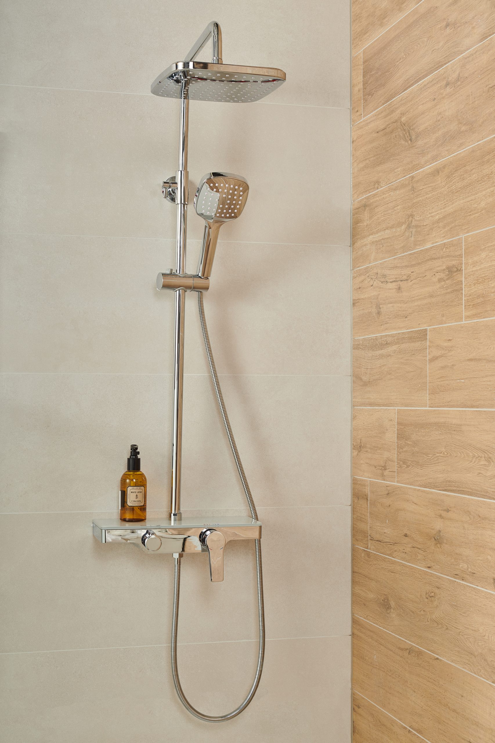 Tuš set uključuje gornji tuš i pomični držač ručnog tuša s tuš slušalicom, mesingani razdjelnik te miješalicu. Visina stupa podesiva je u rasponu od 74 do 123 cm, što omogućuje prilagodbu različitim potrebama. Kvalitetni materijali osiguravaju dugotrajnost i pouzdan rad. Praktično rješenje za svaku kupaonicu.