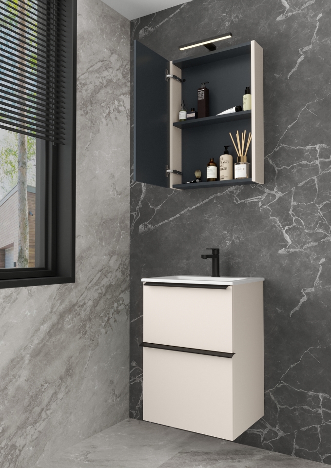 BIT 60 donji kupaonski ormarić s keramičkim umivaonikom u dekoru kašmira unosi nježnost i toplinu u vaš prostor. S dvije ladice koje pružaju obilje prostora za pohranu, ovaj ormarić kombinira funkcionalnost s elegantnim, smirenim tonovima koji vašoj kupaonici daju osjećaj opuštanja i udobnosti. Za samostojeću varijantu, crne mat nogice (šifra 16077) mogu se kupiti odvojeno.