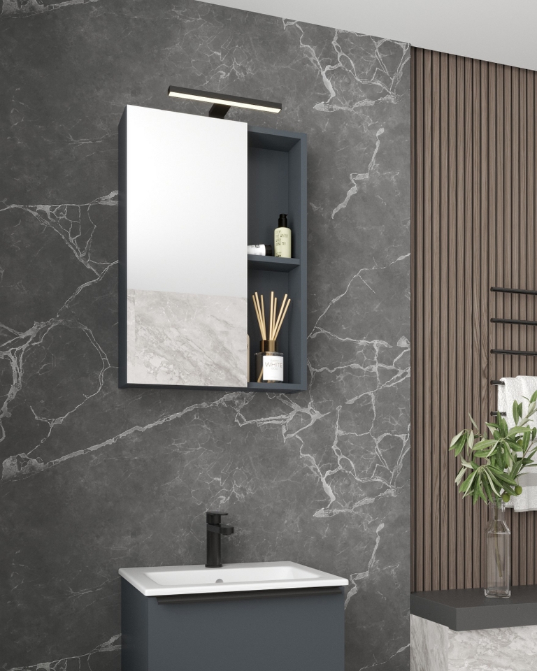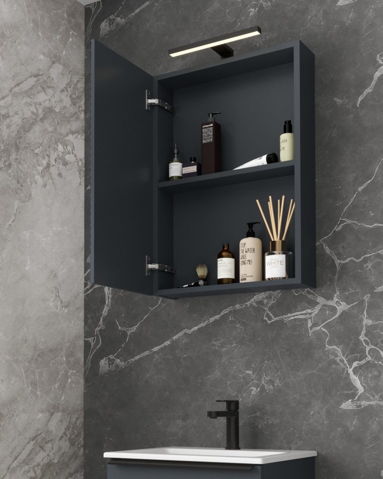 Bit 60 gornji kupaonski ormarić s ogledalom u dekoru grafitno siva, dvije police i LED svjetiljkom nudi kombinaciju jednostavnog dizajna i funkcionalnosti. Grafitno siva boja donosi suvremen i elegantan izgled, dok LED svjetiljka stvara vizualni dojam i unosi svjetlost. Dvije police omogućuju učinkovito organiziranje i maksimalno iskorištavanje prostora. LED specifikacije svjetiljke: 6W 480LM 4000K IP44.