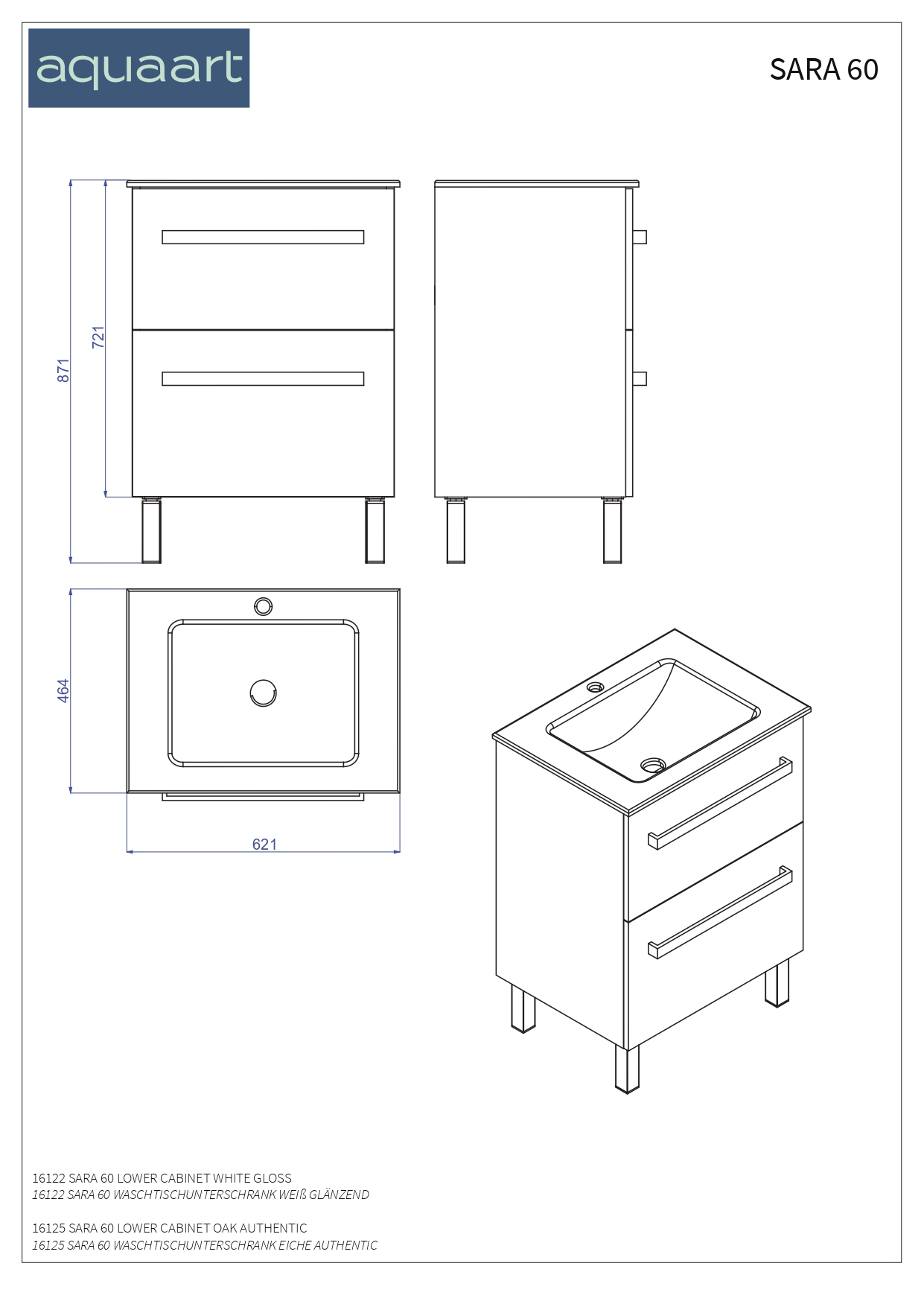 Donji ormarić kupaonskog kompleta SARA u dekoru bijeli sjaj unosi svježinu i uredan izgled u kupaonicu. Opremljen je keramičkim umivaonikom i inox ručkicama koje dodaju diskretan detalj. Praktičan raspored ormarića pomaže u organiziranju stvari koje trebate svakodnevno, a čiste linije lako se uklapaju u različite stilove uređenja. Prodaje se bez sifona.
