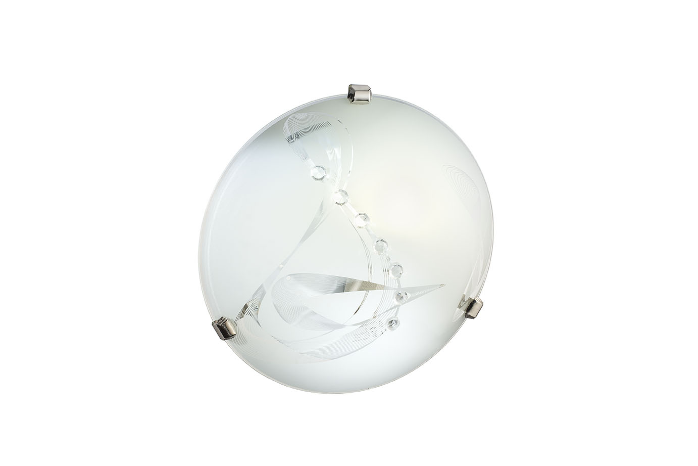 Okrugla bijela staklena plafonjera s jednostavnim uzorkom i akrilnim dekoracijama. Suptilan dizajn i decentni detalji čine je elegantnim rješenjem za osvjetljenje dnevnih boravaka, spavaćih soba i hodnika. Pruža ravnomjerno i ugodno svjetlo, savršeno za svaki interijer.