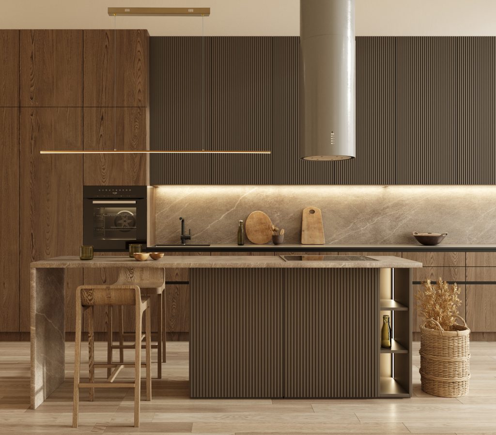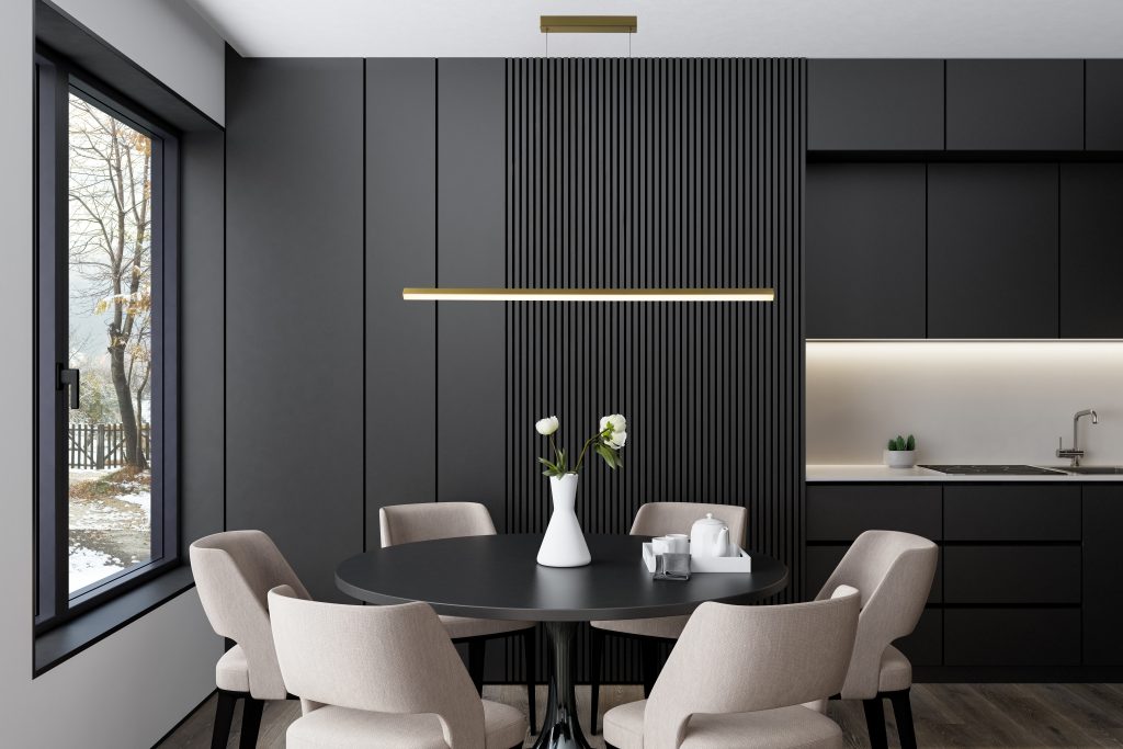 Linearne visilice iznad blagovaonskih stolova i kuhinjskih otoka postaju dominantan izbor. Njihova precizna forma stvara vizualni red, dok ravnomjerno raspoređeno svjetlo prati funkciju prostora bez suvišnih naglasaka.